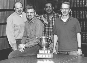 “Mooters Marvin Klassen, Tyson Dahlem, Sandeep Dhir, and Will Clements with the Malcolm M. MacIntyre Memorial Cup. Missing from the photograph: coach Bill Roe. First place, followed by a second place at the Sopinka Moot, with only five weeks of practice.”